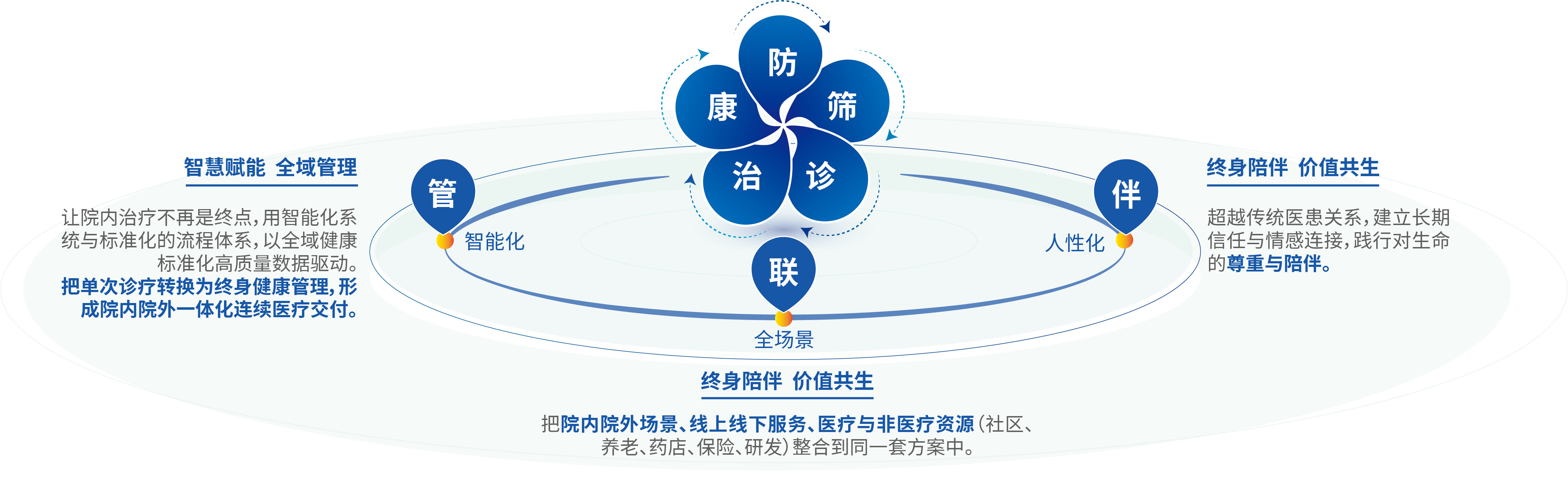 我们以“为客户提供值得信赖的肿瘤全周期服务”为使命,致力于覆盖“防 → 筛 → 诊 → 治 → 康” + “管、联、伴”全域全周期,实现从“治病”到“管病”的转变,打造一站式、连续性、终身健康管理体系。